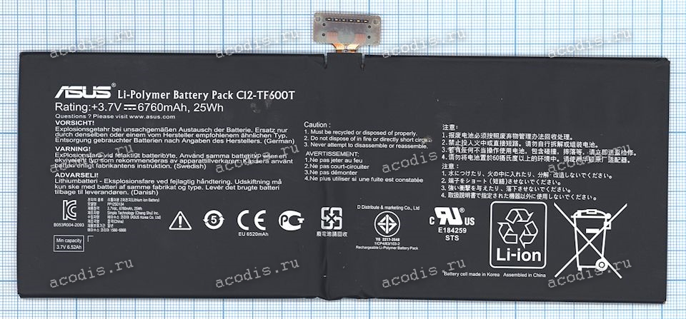 Описание: АКБ Asus VivoTab RT TF600T (3,7V 6760mAh 25Wh 6pin (B200-0008010, C12-TF600T) original