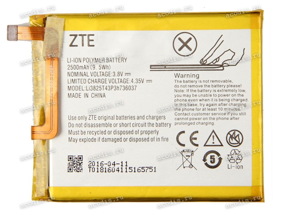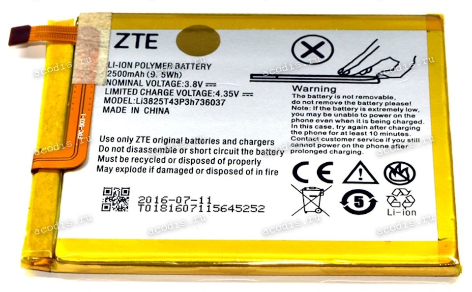 Аккумуляторная перезаряжаемая батарея (Main replacement rechargeable Battery) ZTE Blade V7 Lite, A2, Small Fresh 4 (3,8v, 2500mAh) Li3825T43P3h736037 оригинальный разбор