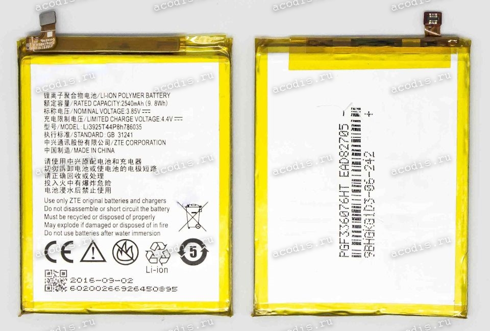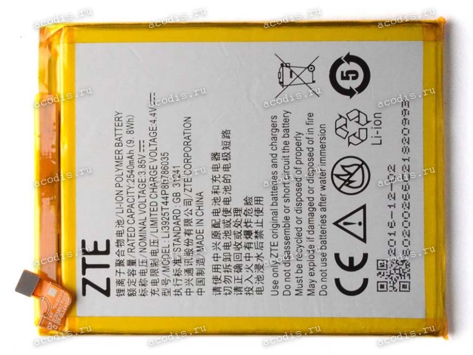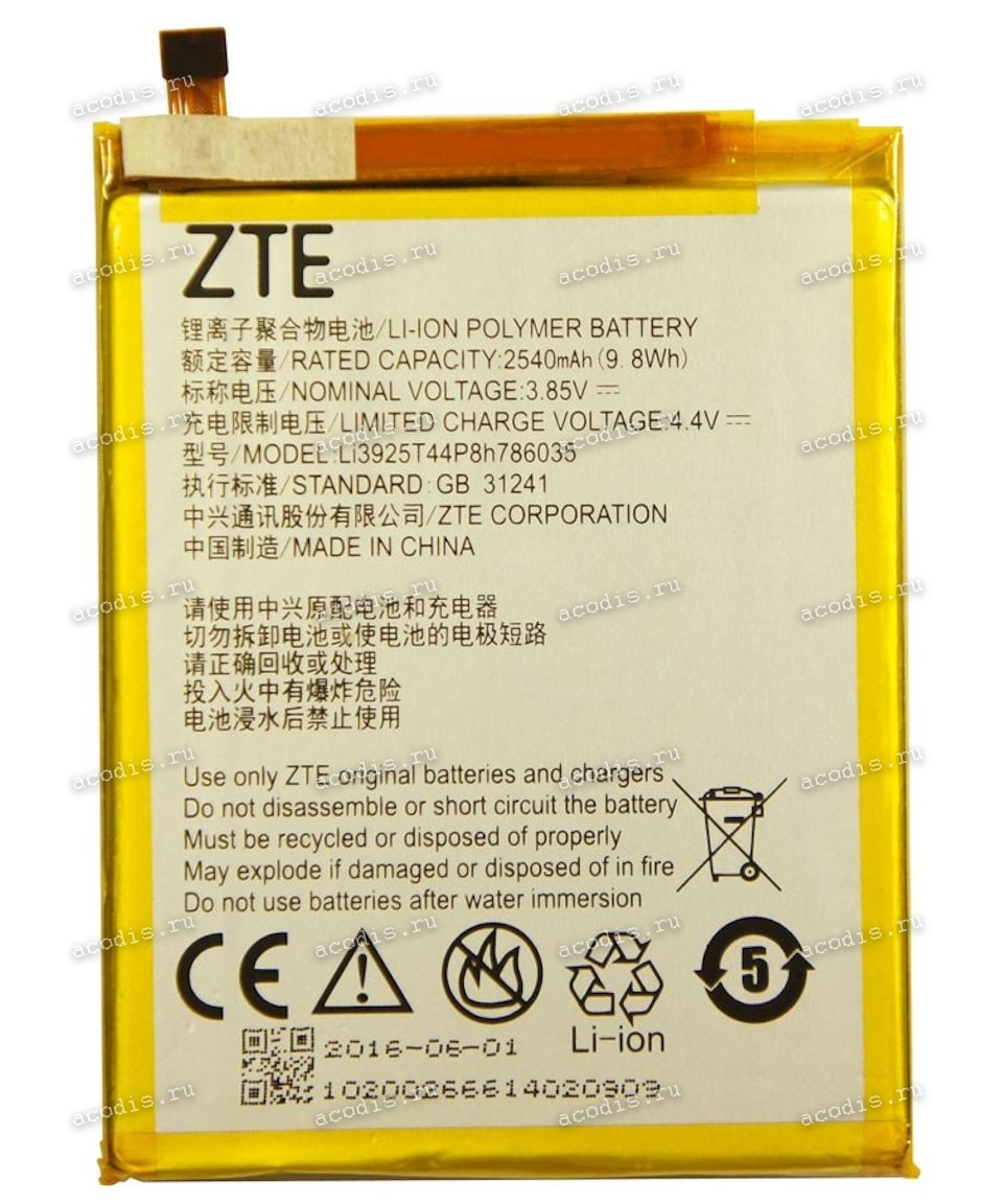 Характеристики АКБ ZTE Blade A910, Blade V7, Blade Z10 (3,85v, 2540mAh) Li3925T44P8h786035 оригинальный