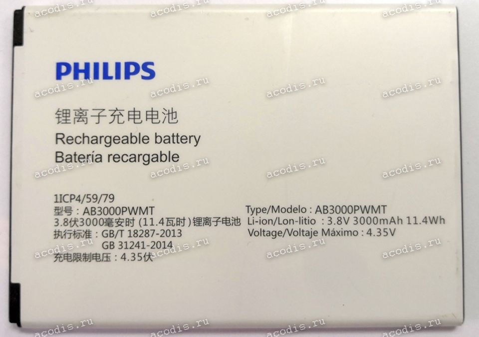 Характеристики АКБ Philips S395 AB3000PWMT (3,8v 3000mAh 11,4Wh) new оригинальный